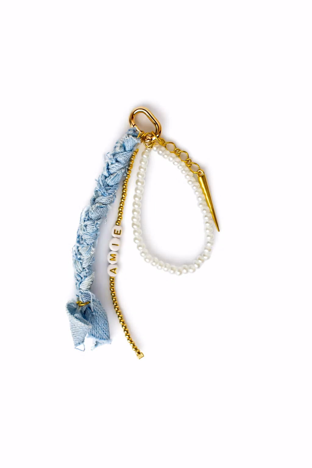 Ett pärlband med vita små pärlor, rostfri guldnit, en fläta av jeanstyg samt ett guldigt pärlband med varlfri text.