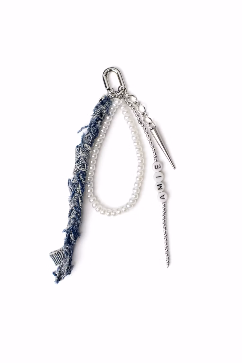 Ett pärlband med vita små pärlor, rostfri silvernit, en fläta av jeanstyg samt ett silvrigt pärlband med valfri text.