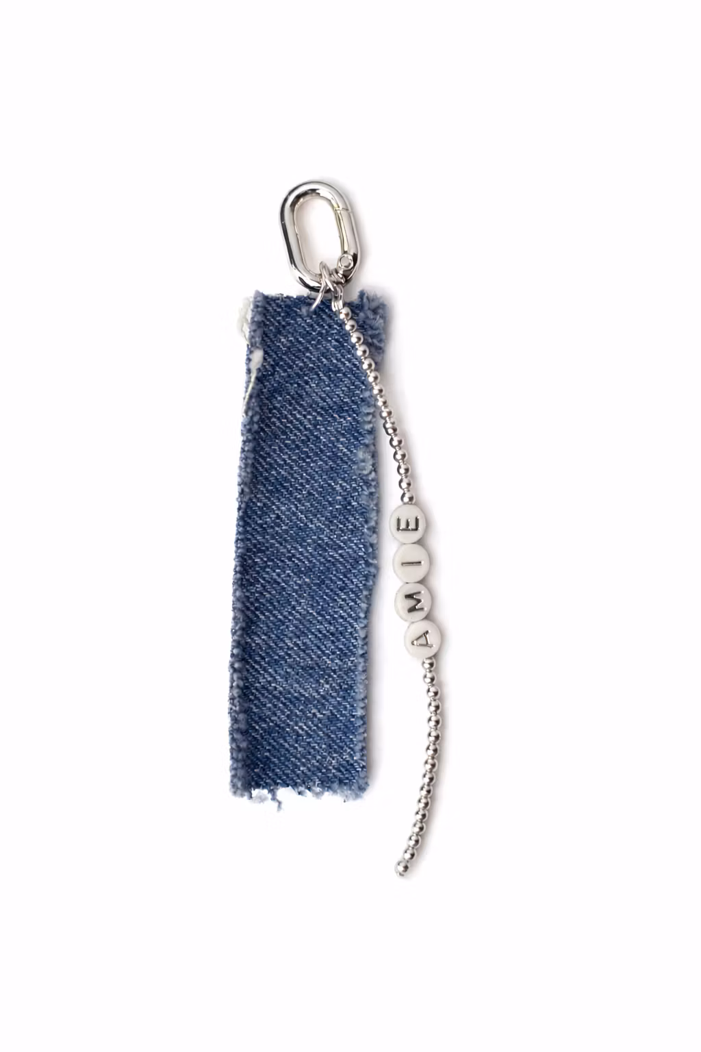 En mörkblå del av jeanstyg och ett silvrigt pärlband med valfri text.